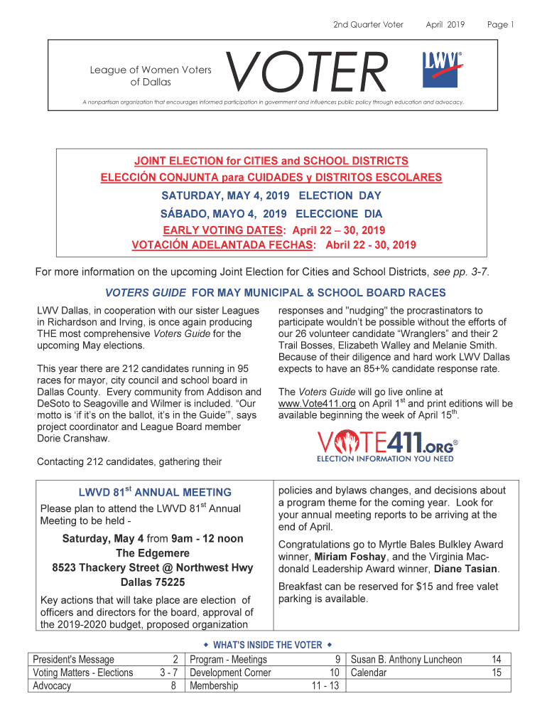 2nd Quarter Interleague of Women Voters of Dallas April 2019Page 1VOTERA nonpartisan organization that encourages informed participation in government and influences public policy through education