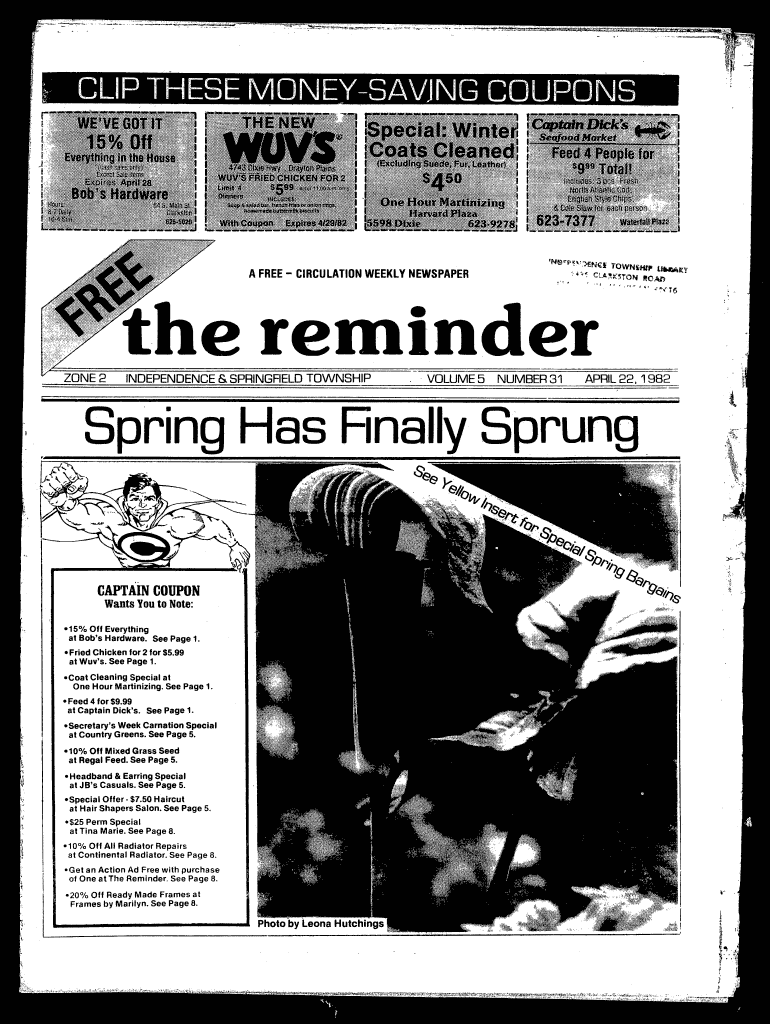 CLIP This MONEY. SAVING COUPONS FREE CIRCULATION WEEKLY NEWSPAPEReremlD her INDEPENDENCE & SPRINGFIELD TOWNSHIPVOLUME 5NUMBER 31APRIL 22, 1 982Spring Has Finally Sprung...CAPTAIN COUPON Wants You