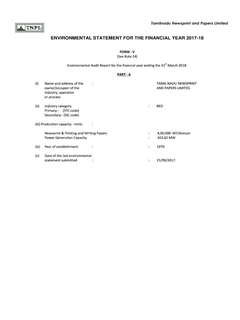 Tamil Nadu Newsprint and Papers LimitedENVIRONMENTAL STATEMENT FOR THE FINANCIAL YEAR 201718 FORM V (See Rule:14) environmental Audit Report for the financial year ending the 31 March 2018. PART A