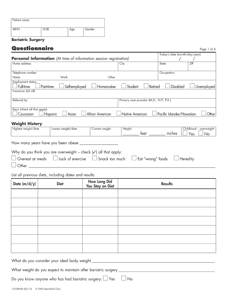 The Bariatric Surgery Questionnaire is a medical consent form used by patients to provide essential health information for evaluating candidacy for bariatric surgery.