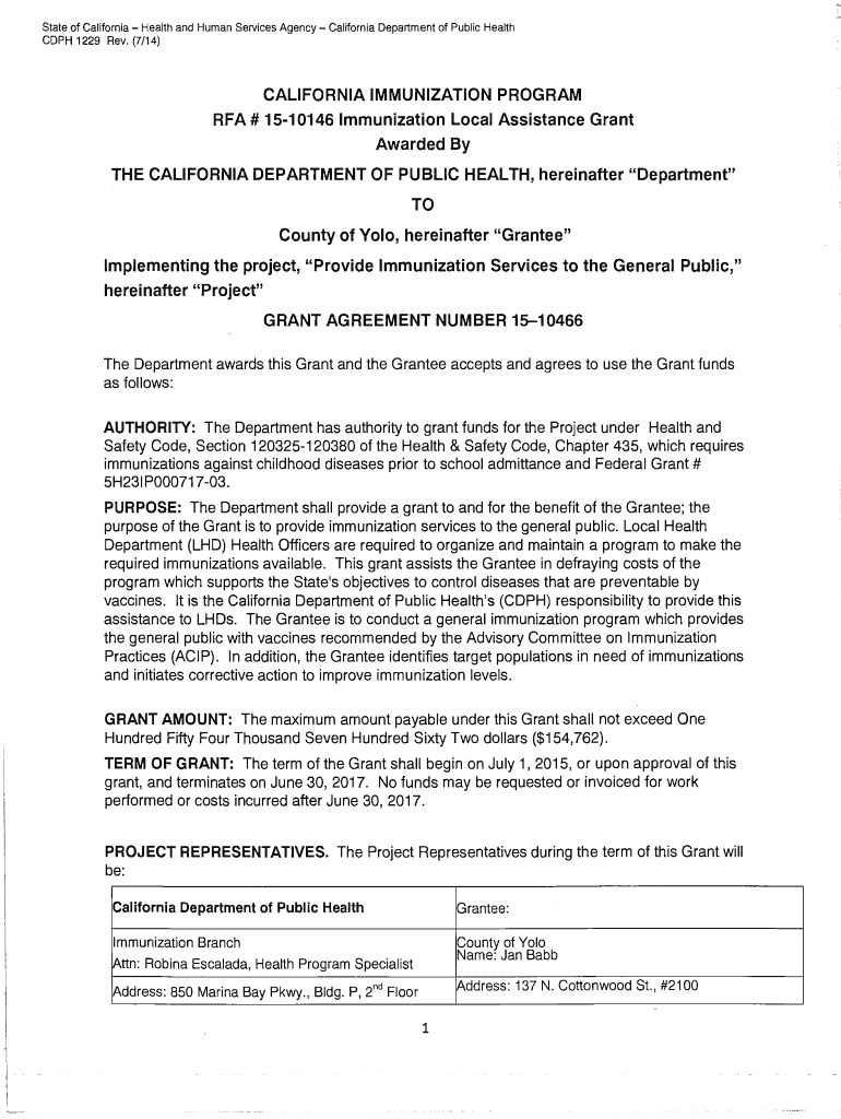 State of California Health and Human Services Agency California Department of Public Health CDP 1229 Rev. (7/14)CALIFORNIA IMMUNIZATION PROGRAM RFA # 1510146 Immunization Local Assistance Grant Awarded