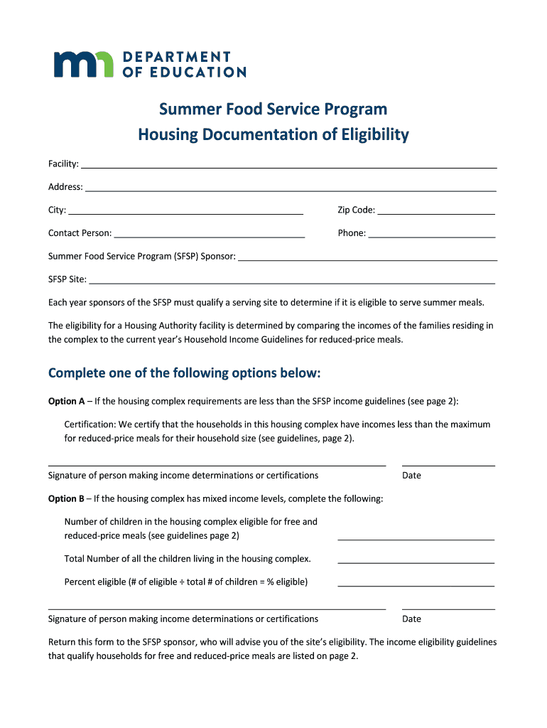 Get the free Summer Food Service Program Housing Documentation of Eligibility - education mn