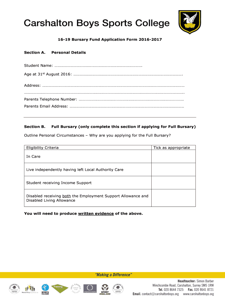 1619 Bursary Fund Application Form 20162017 Section A. Personal DetailsStudent Name:. Age at 31st August 2016:. Address: