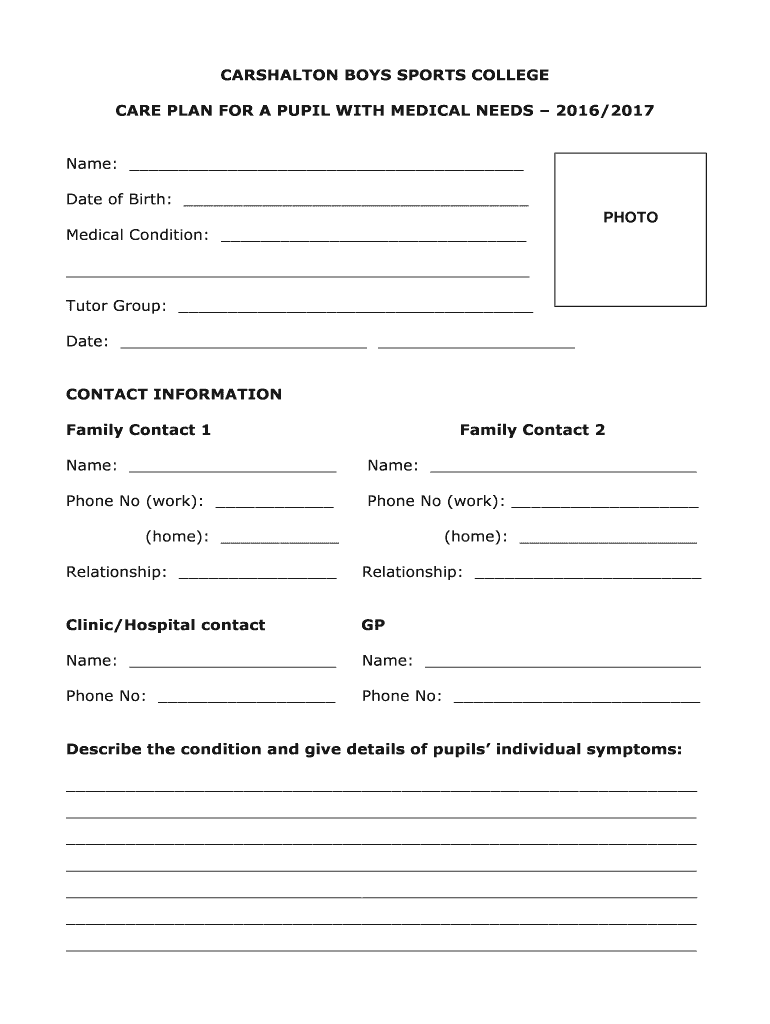 CARLTON BOYS SPORTS COLLEGE CARE Plans FOR A PUPIL WITH MEDICAL NEEDS 2016/2017 Name: Date of Birth: Medical Condition: PHOTO Tutor Group: Date: CONTACT INFORMATION Family Contact 1Family Contact