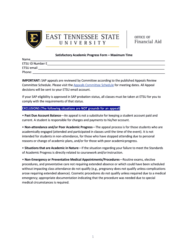EAST TENNESSEE STATE UNIVERSITY Name ETS ID Number E ETS email Phone:OFFICE Offing ill Dissatisfactory Academic Progress Form Maximum TimeIMPORTANT: SAP appeals are reviewed by Committee according