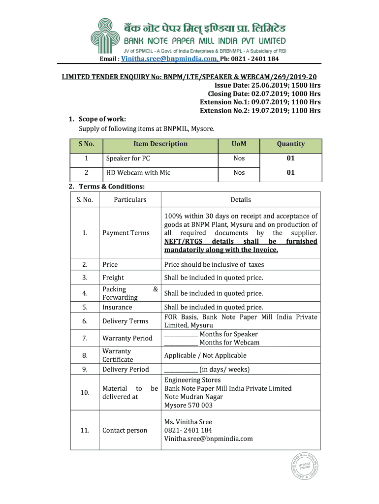 Email : Initial. Free bnpmindia.com, pH: 0821 2401 184LIMITED TENDER Inquiry No: BNP/LTE/SPEAKER & WEBCAM/269/201920 Issue Date: 25.06.2019; 1500 Hrs Closing Date: 02.07.2019; 1000 Hrs Extension No.1: