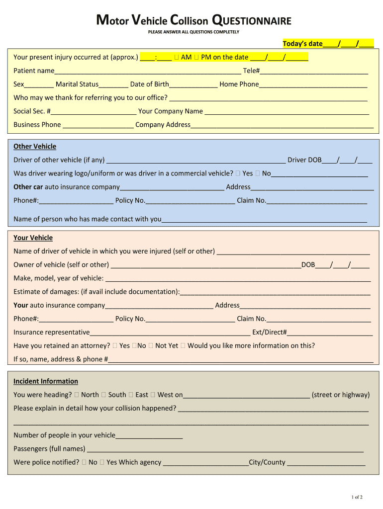 Motor Vehicle Collision QUESTIONNAIRE PLEASE ANSWER ALL QUESTIONS COMPLETELYTodays date / / Your present injury occurred at (approx.) AM PM on the date / / Patient name Tell# Sex Marital Status Date