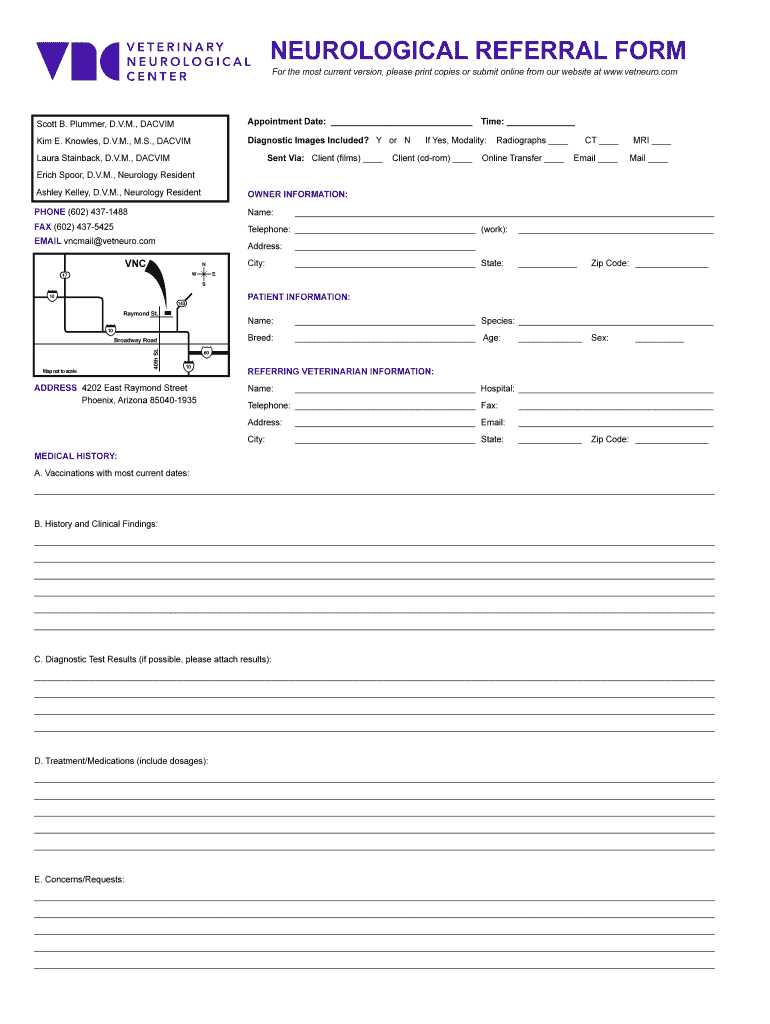 NEUROLOGICAL REFERRAL FORM For the most current version, please print copies or submit online from our website at www.vetneuro.comScott B. Plummer, D.V.M., DACVIMAppointment Date: Time: Kim E. Knowles,