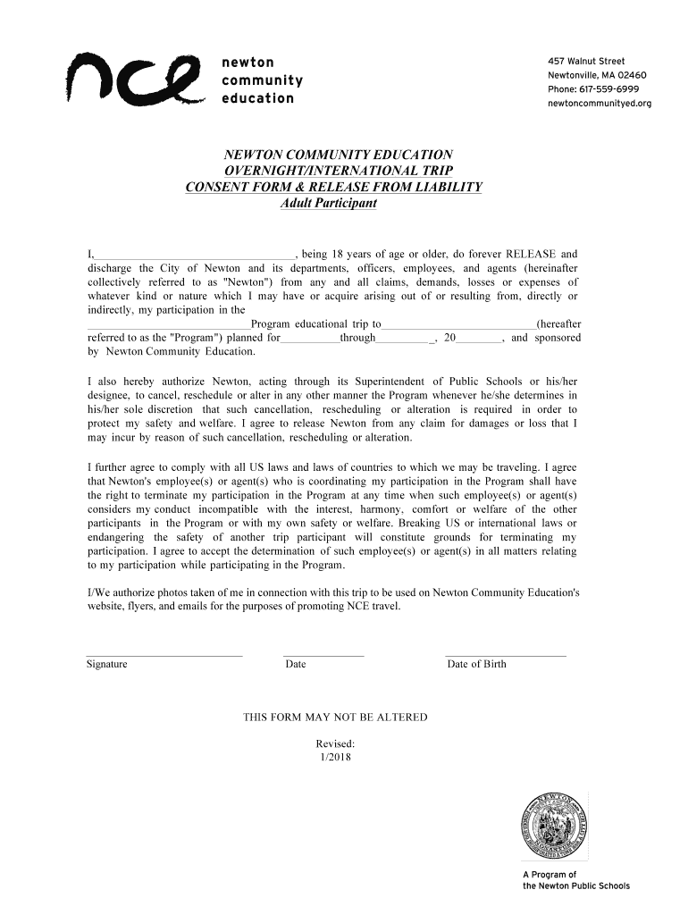 NEWTON COMMUNITY EDUCATION OVERNIGHT/INTERNATIONAL TRIP CONSENT FORM & RELEASE FROM LIABILITY Adult Participants, being 18 years of age or older, do forever RELEASE and discharge the City of Newton