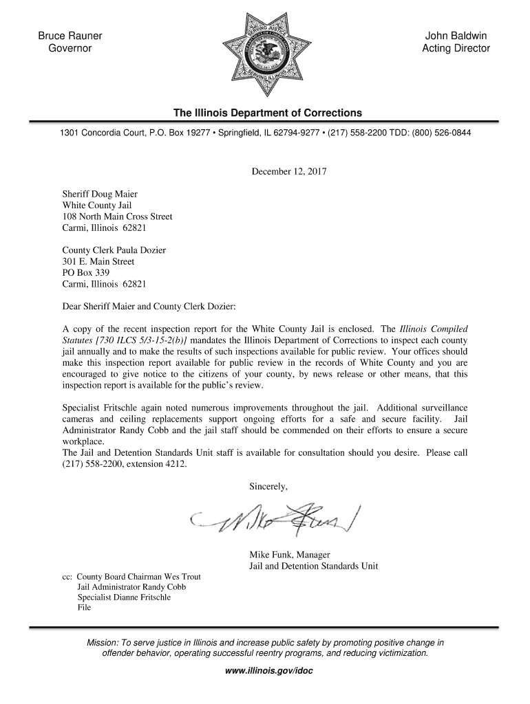 Bruce Rather Governor John Baldwin Acting Directorate Illinois Department of Corrections 1301 Concordia Court, P.O. Box 19277 Springfield, IL 627949277 (217) 5582200 TDD: (800) 5260844December 12,