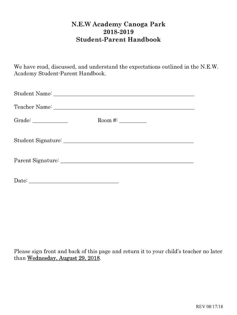 N.E.W Academy Canola Park 20182019 StudentParent Handbook have read, discussed, and understand the expectations outlined in the N.E.W. Academy StudentParent Handbook. Student Name: Teacher Name: Grade: