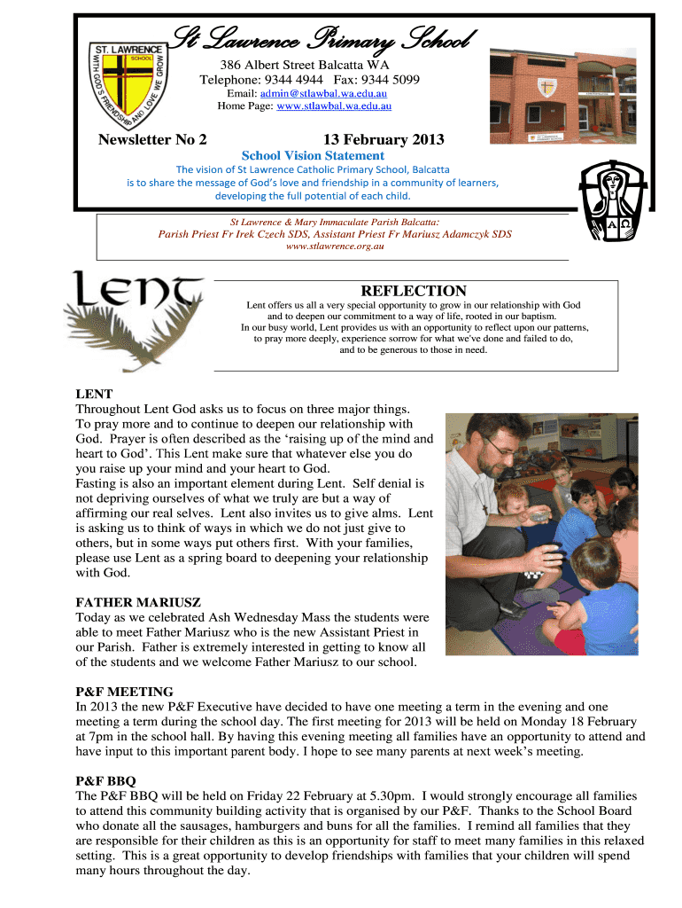 St Lawrence Primary School 386 Albert Street Calcutta WA Telephone: 9344 4944 Fax: 9344 5099 Email: admin Straubel.Wei.edu.AU Home Page: www.stlawbal.wa.edu.auNewsletter No 213 February 2013 School