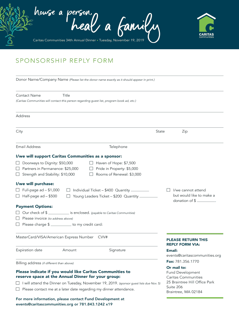 House a person, heal a familyCaritas Communities 34th Annual Dinner Tuesday, November 19, 2019SPONSORSHIP REPLY FORM Donor Name/Company Name (Please list the donor name exactly as it should appear