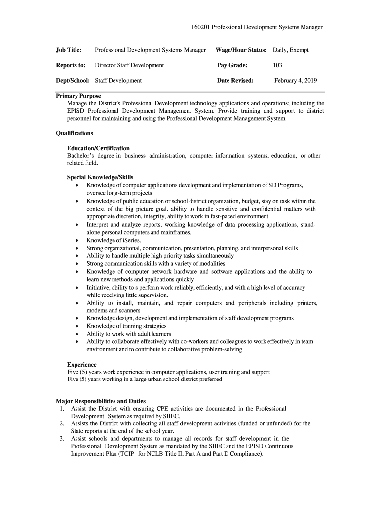160201 Professional Development Systems Manager Job Title:Professional Development Systems Managerial/Hour Status:Daily, ExemptReports to:Director Staff Developmental Grade:103Date Revised:February