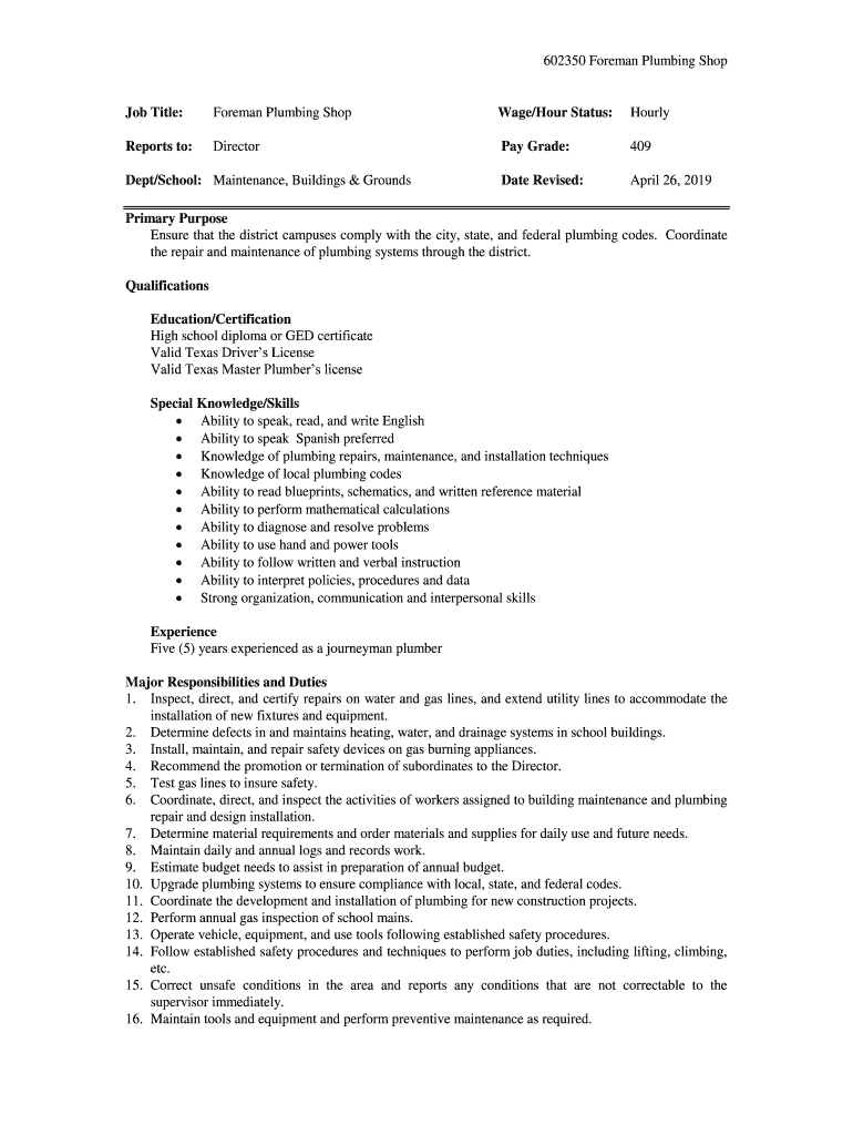 602350 Foreman Plumbing Shop Job Title:Foreman Plumbing Shopware/Hour Status:HourlyReports to:Directory Grade:409Date Revised:April 26, 2019Dept/School: Maintenance, Buildings & GroundsPrimary Purpose