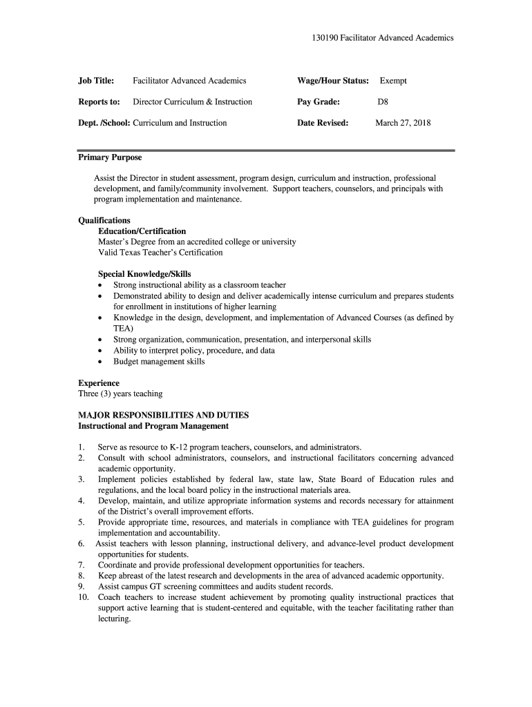 Get the free Job Title: Facilitator Advanced Academics Wage/Hour Status ...