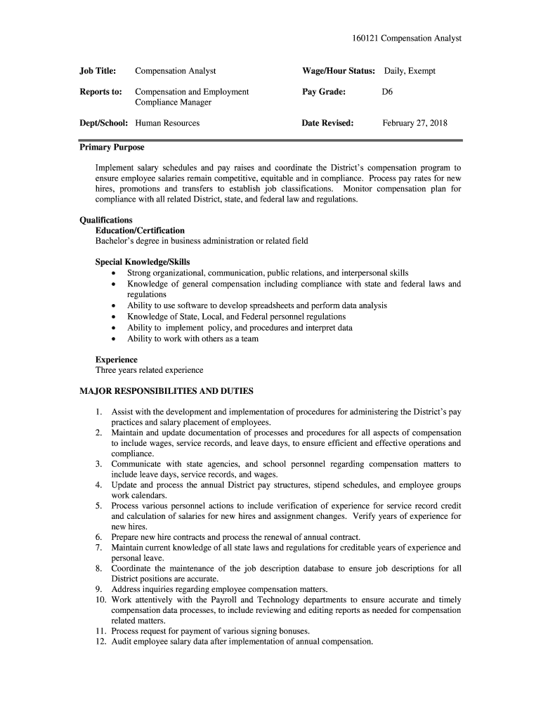 160121 Compensation Analyst Job Title:Compensation AnalystWage/Hour Status:Daily, ExemptReports to:Compensation and Employment