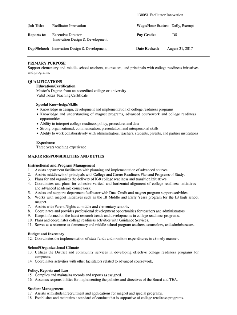 130051 Facilitator Innovation Job Title:Facilitator Innovational/Hour Status: Daily, ExemptReports to:Executive Director Innovation Design & Developmental Grade:Dept/School: Innovation Design & Developmental