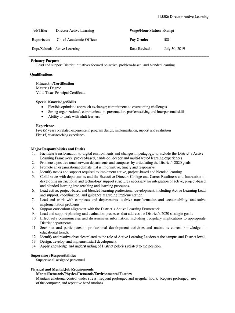 115586 Director Active Learning Job Title:Director Active LearningWage/Hour Status: ExemptReports to:Chief Academic Officer Grade:108Date Revised:July 30, 2019Dept/School: Active LearningPrimary Purpose