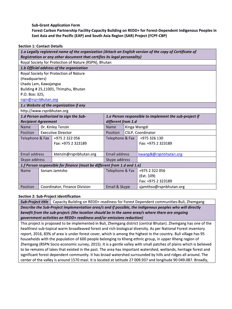 SubGrant Application Form Forest Carbon Partnership FacilityCapacity Building on RED+ for ForestDependent Indigenous Peoples in East Asia and the Pacific (EAP) and South Asia Region (SAR) Project