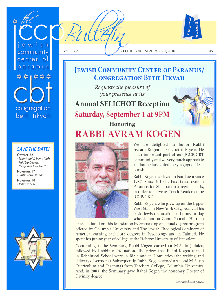 The j e w i s h community center of para mus Bullet in VOL. LXVII21 ELUL 5778 SEPTEMBER 1, 2018No. 1Jewish Community Center of Para mus/ Congregation Beth Rival Requests the pleasure of your presence