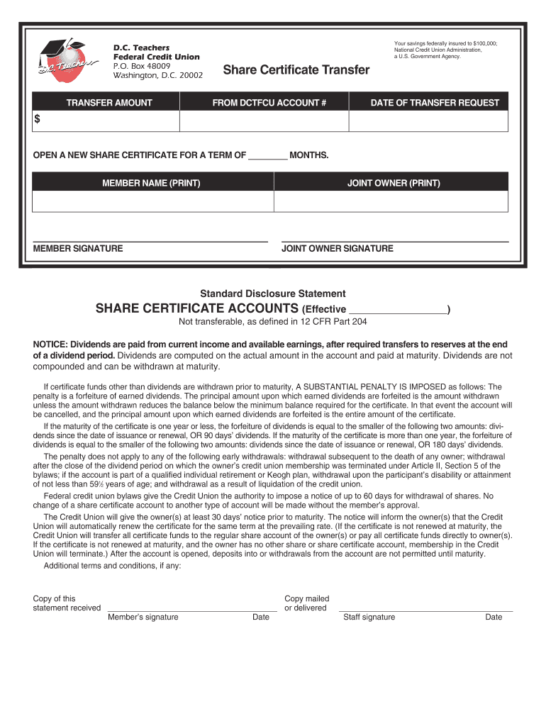 Any member of the D.C. Teachers National Credit Union, including joint owners of share certificates, can use this form to transfer funds for a new certificate account.