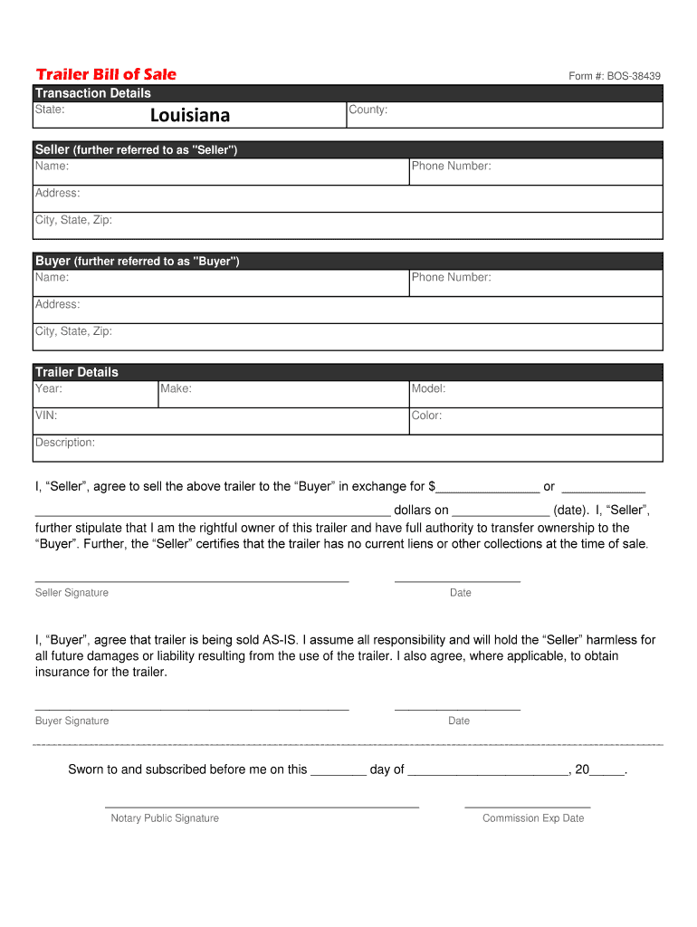 Trailer Bill of Waveform #: BOS38439Transaction Details State:LouisianaCounty:Seller (further referred to as “Seller “) Name:Phone Number:Address: City, State, Zip:Buyer (further referred to as