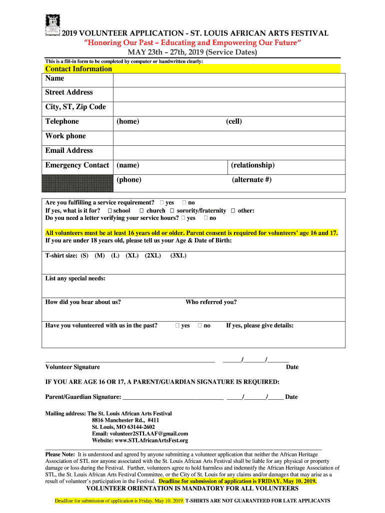 2019 VOLUNTEER APPLICATION ST. LOUIS AFRICAN ARTS FESTIVAL Honoring Our Past Educating and Empowering Our Future MAY 23rd 27th, 2019 (Service Dates) This is a filling form to be completed by computer