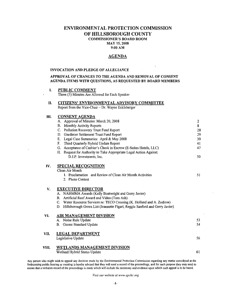ENVIRONMENTAL PROTECTION COMMISSION OF HILLSBOROUGH COUNTY COMMISSIONER IS Boardroom MAY 15,20089:00AMAGENDA INVOCATION AND PLEDGE OF ALLEGIANCE APPROVAL OF CHANGES TO THE AGENDA INP REMOVAL OF CONSENT