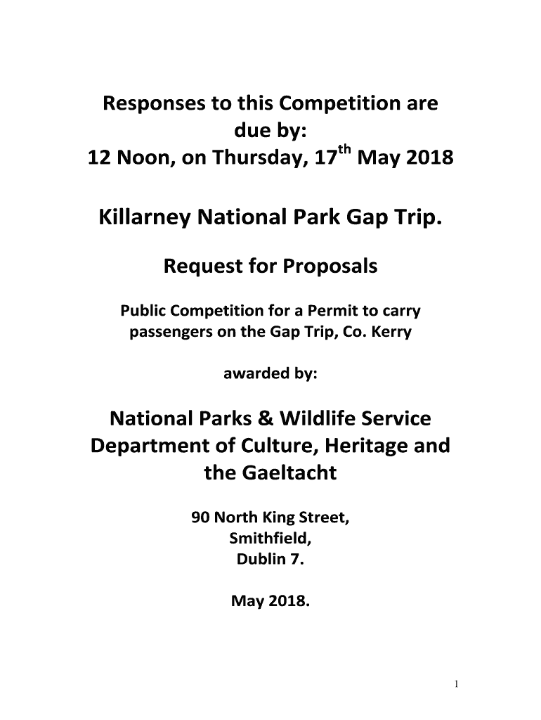 Responses to this Competition are due by: 12 Noon, on Thursday, 17th May 2018Killarney National Park Gap Trip. Request for Proposals Public Competition for a Permit to carry passengers on the Gap