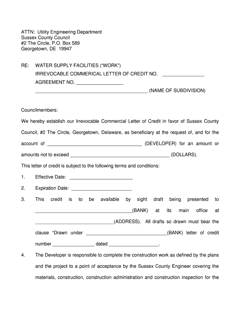 ATTN: Utility Engineering Department Sussex County Council #2 The Circle, P.O. Box 589 Georgetown, DE 19947RE:WATER SUPPLY FACILITIES (WORK) IRREVOCABLE COMMERCIAL LETTER OF CREDIT NO. AGREEMENT NO.