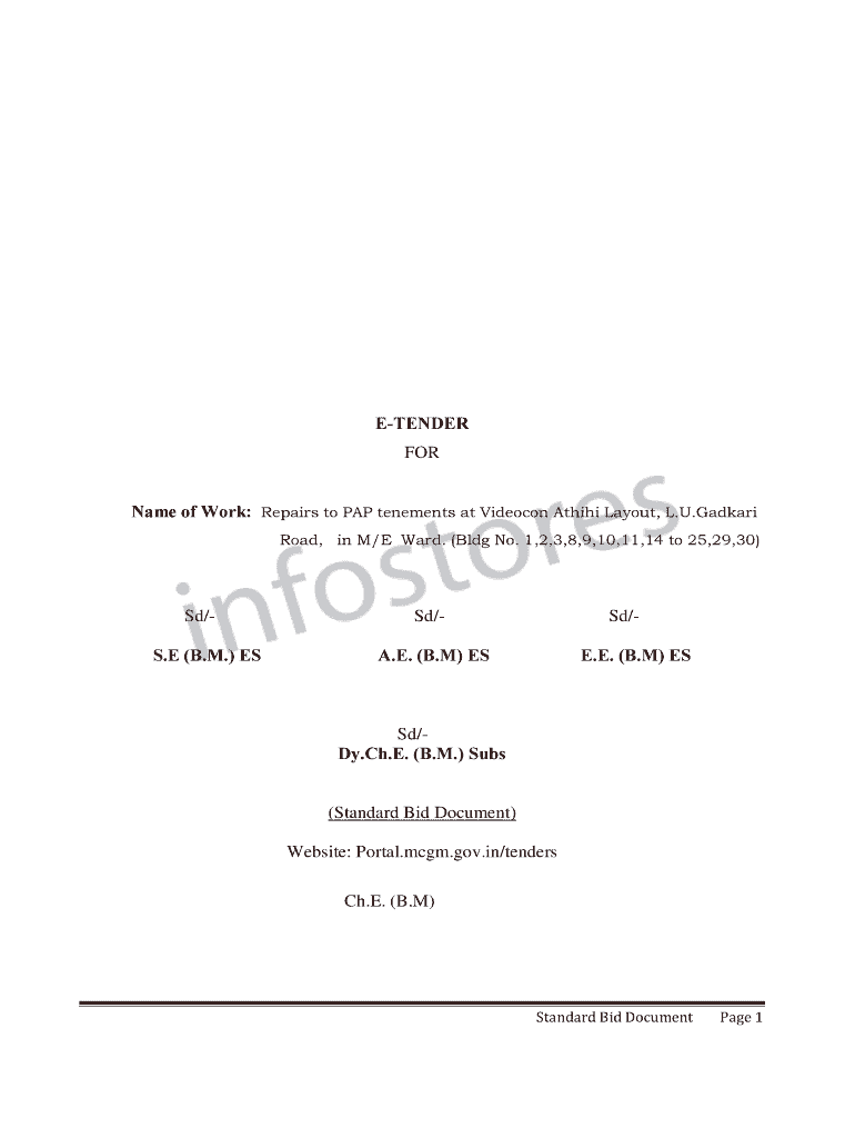 TENDER FOR Name of Work: Repairs to PAP tenements at Videocon This Layout, L.U. Gadara Road, in M/E Ward. (Bldg No. 1,2,3,8,9,10,11,14 to 25,29,30)SD/SD/SD/d/S. E (B.M.) ESA. E. (B. M) ESE. E. (B.