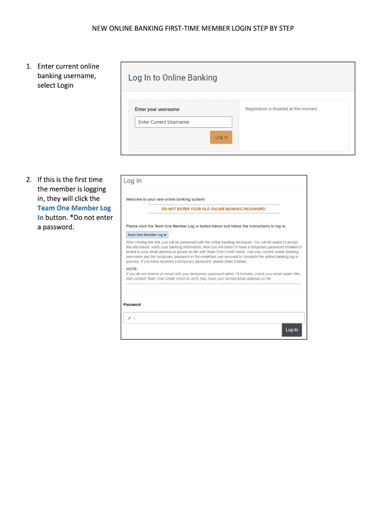 NEW ONLINE BANKING FIRST TIME MEMBER LOGIN STEP BY STEP1. Enter current online banking username, select Login2. If this is the first time the member is logging in, they will click the Team One Member