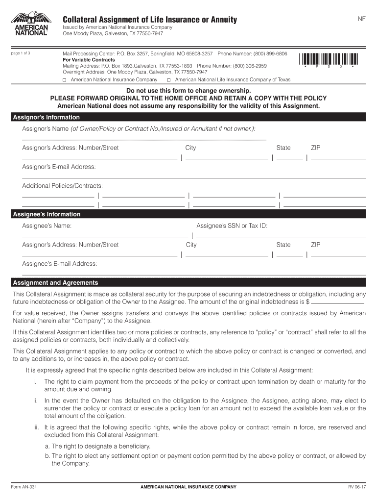 Collateral Assignment of Life Insurance or AnnuityNFIssued by American National Insurance Company One Moody Plaza, Galveston, TX 775507947Mail Processing Center: P.O. Box 3257, Springfield, MO 658083257