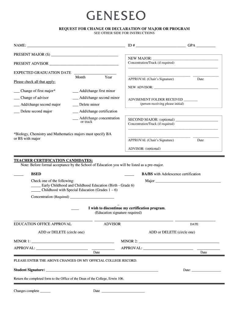 REQUEST FOR CHANGE OR DECLARATION OF MAJOR OR PROGRAM SEE OTHER SIDE FOR INSTRUCTIONSNAME: ID # GPA PRESENT MAJOR (S) NEW MAJOR: PRESENT ADVISOR Concentration/Track (if required) EXPECTED GRADUATION