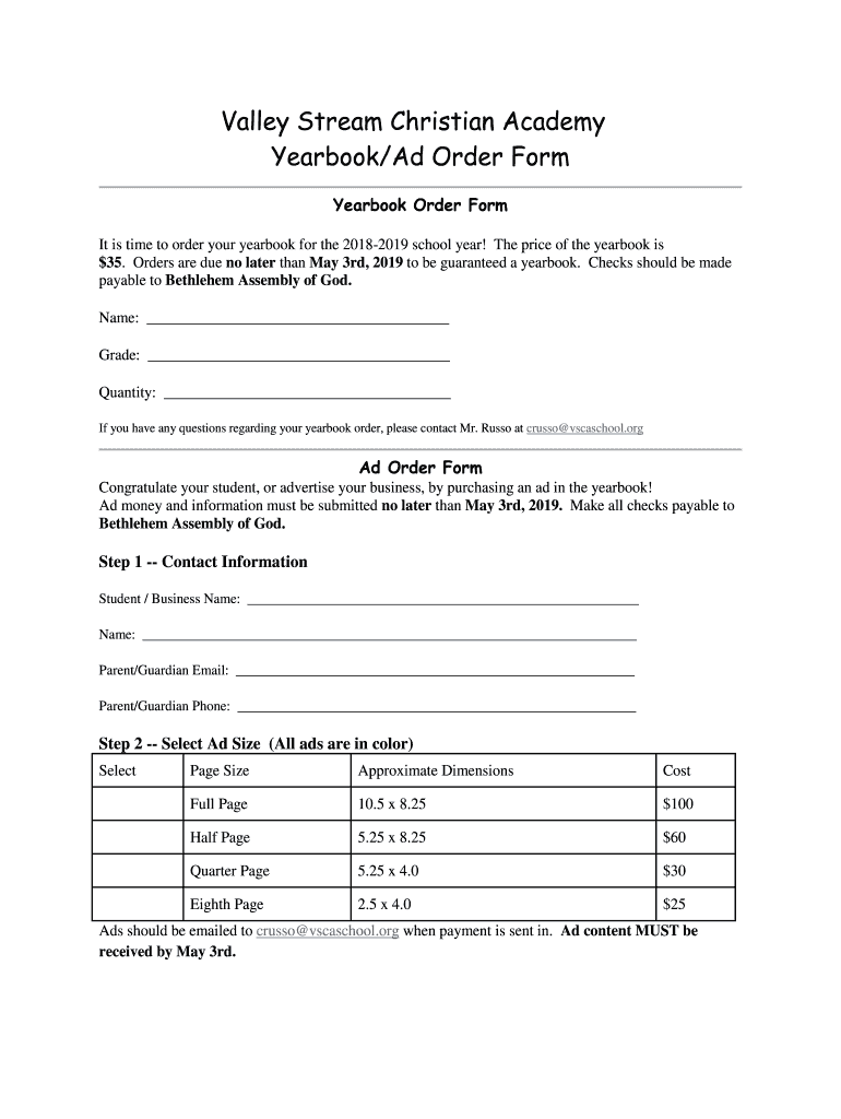 Valley Stream Christian Academy Yearbook/Ad Order Form Yearbook Order Form It is time to order your yearbook for the 20182019 school year! The price of the yearbook is $35. Orders are due no later