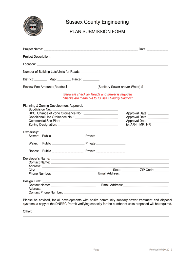 Sussex County Engineering PLAN SUBMISSION FORMProject Name:Date:Project Description: Location: Number of Building Lots/Units for Roads: District:Map:Parcel:Review Fee Amount: (Roads) $(Sanitary Sewer