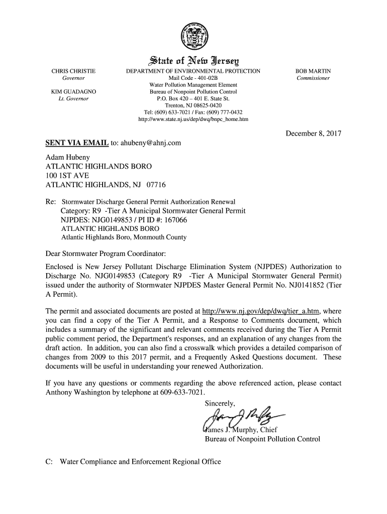 CHRIS CHRISTIE Governor KIM GUANO Lt. GovernorDEPARTMENT OF ENVIRONMENTAL PROTECTION Mail Code 40102B Water Pollution Management Element Bureau of Nonpoint Pollution Control P.O. Box 420 401 E. State
