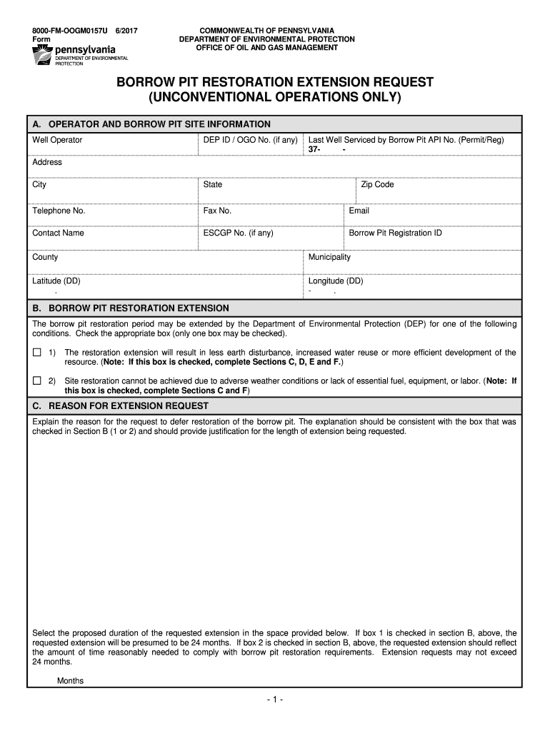 8000FMOOGM0157U Form6/2017COMMONWEALTH OF PENNSYLVANIA DEPARTMENT OF ENVIRONMENTAL PROTECTION OFFICE OF OIL AND GAS MANAGEMENTBORROW PIT RESTORATION EXTENSION REQUEST (UNCONVENTIONAL OPERATIONS ONLY)