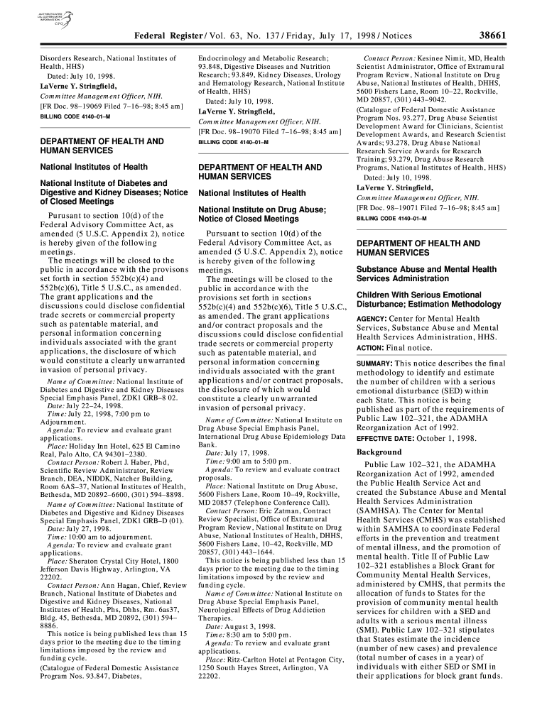 Federal Register / Vol. 63, No. 137 / Friday, July 17, 1998 / Notices Disorders Research, National Institutes of Health, HHS) Dated: July 10, 1998. Laverne Y. Springfield, Committee Management Officer,