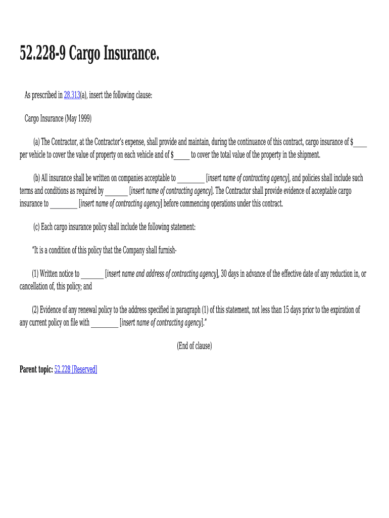 52.2289 Cargo Insurance. As prescribed in 28.313(a), insert the following clause: Cargo Insurance (May 1999) (a) The Contractor, at the Contractors expense, shall provide and maintain, during the