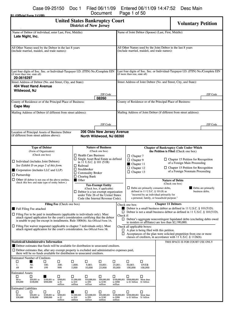 Case 0925150Doc 1Filed 06/11/09 Entered 06/11/09 14:47:52 Document Page 1 of 50B1 (Official Form 1)(1/08)United States Bankruptcy Courtesy Involuntary PetitionDistrict of New Jersey b k 1 F o r m.