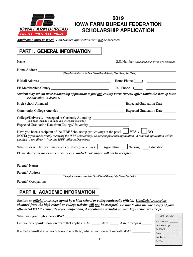 2019 IOWA FARM BUREAU FEDERATION SCHOLARSHIP APPLICATION must be typed. Handwritten applications will not be accepted. Names. S. Number (Required only if you are selected)Home Address (Complete Address