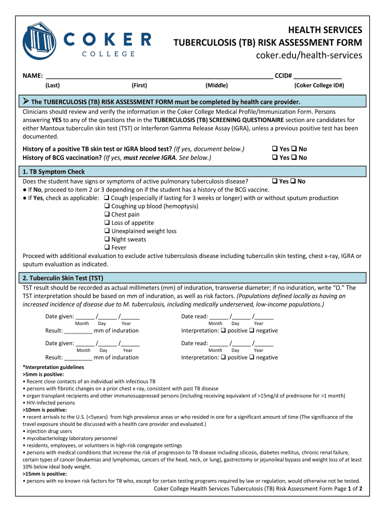 Get the free Tuberculosis (TB) Risk Assessment Form - Coker College
