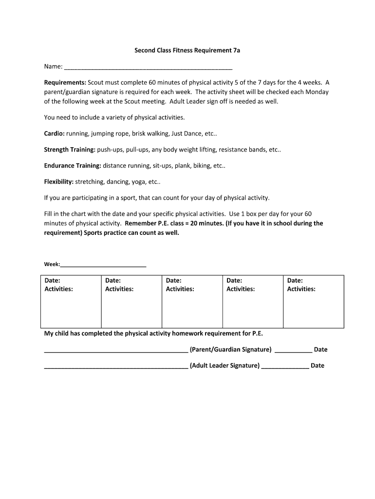 SecondClassFitnessRequirement7a Name: Requirements:Scoutmustcomplete60minutesofphysicalactivity5ofthe7daysforthe4weeks. A parent/guardiansignatureisrequiredforeachweek. TheactivitysheetwillbecheckedeachMonday