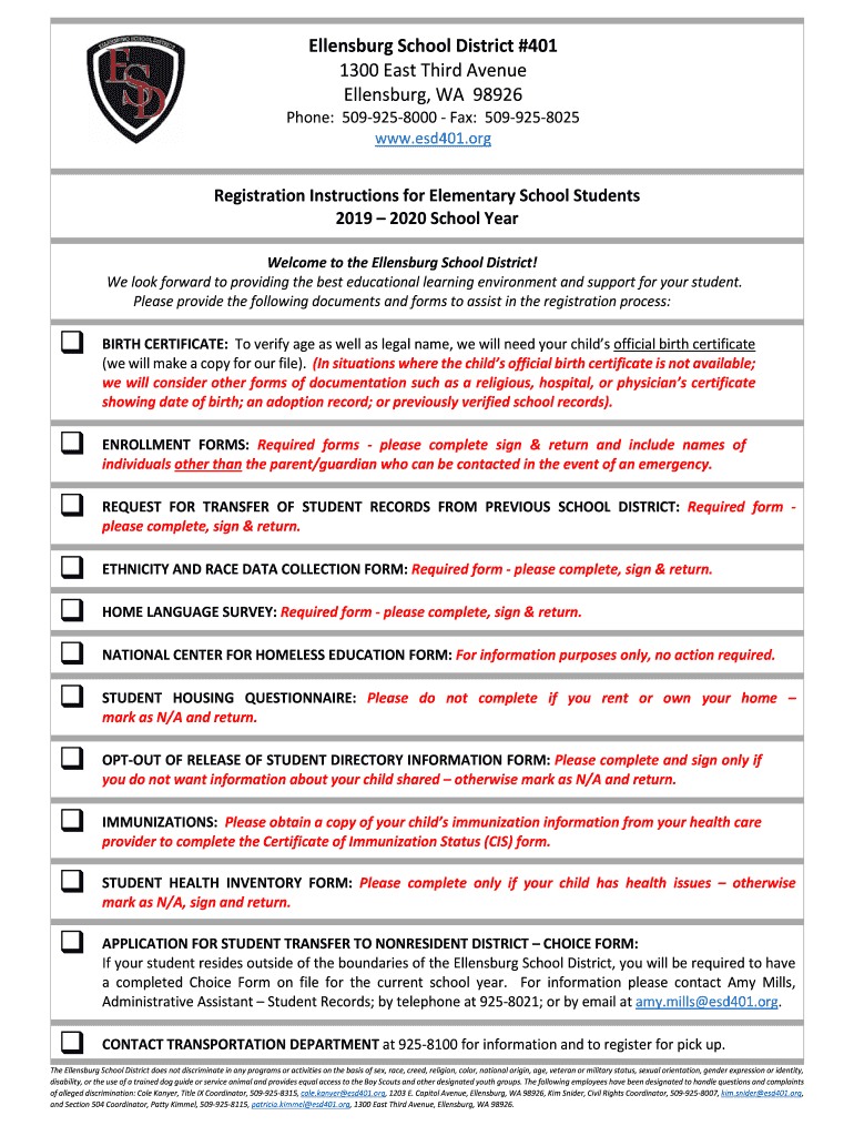 Ellensburg School District #401 1300 East Third Avenue Ellensburg, WA 98926Phone: 5099258000 Fax: 5099258025 www.esd401.orgRegistration Instructions for Elementary School Students 2019 2020 School