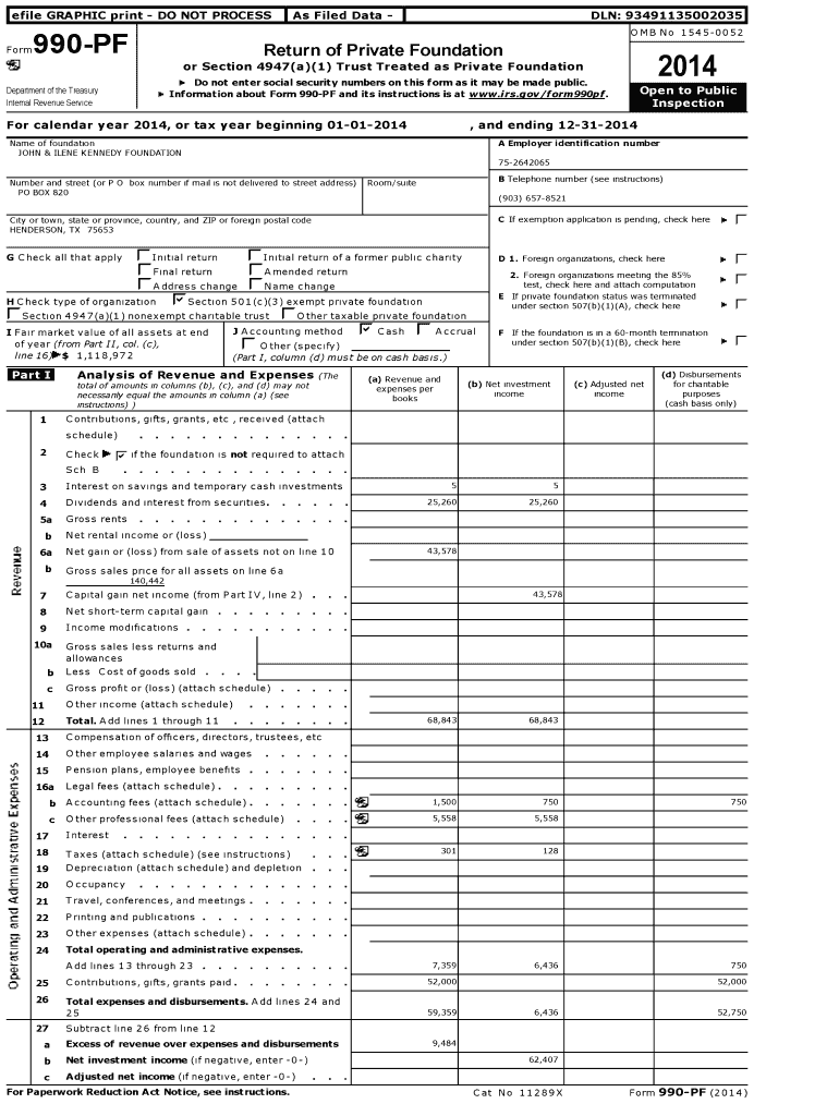 Le file GRAPHIC print DO NOT Processors Filed Data DAN: 93491135002035 OMB No 15450052990PFReturn of Private Foundation2014or Section 4947(a)(1) Trust Treated as Private Foundation 0 Do not enter