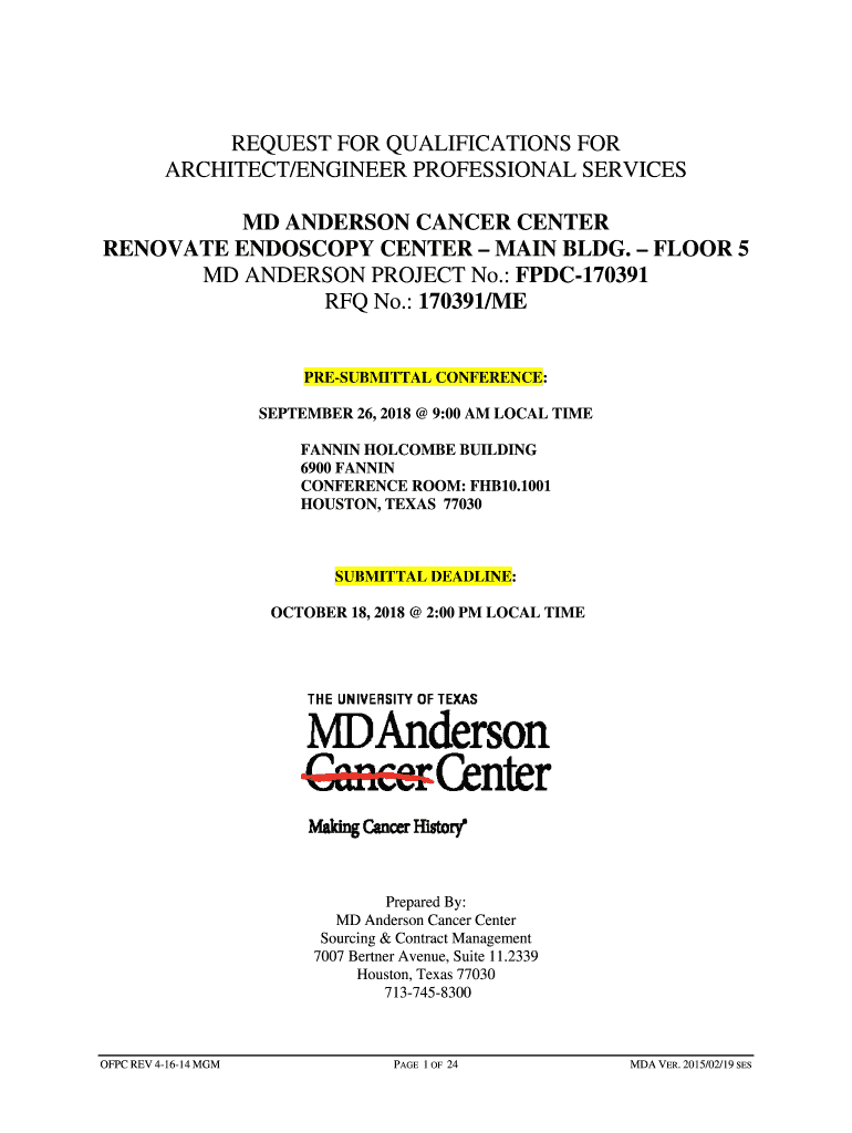 REQUEST FOR QUALIFICATIONS FOR ARCHITECT/ENGINEER PROFESSIONAL SERVICES MD ANDERSON CANCER CENTER RENOVATE ENDOSCOPY CENTER MAIN BLDG. FLOOR 5 MD ANDERSON PROJECT No.: FPDC170391 RFQ No.: 170391/MEPRESUBMITTAL