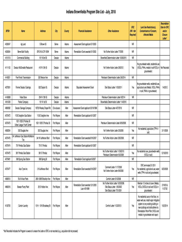 Indiana Brownfield Program Site List July, 2018BFD×NameAddressCityCountyFinancial Assistance4030047Ag Lands Brown StBerneAdamsAssessment Grant applicant 2/1/20034030004Berne Bulk Facility 218 & CR