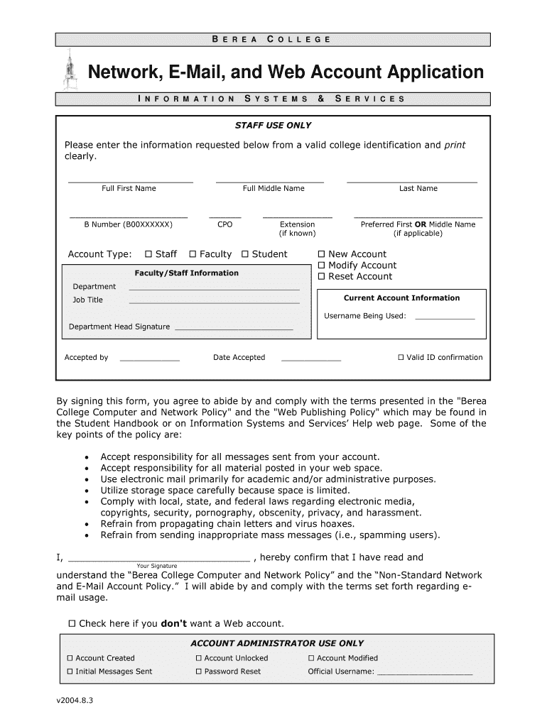 B E R E AC O L L E GE Network, Email, and Web Account Application I N F O R M A T I O NS Y S T E M S&S E R V I C ES STAFF USE ONLYPlease enter the information requested below from a valid college